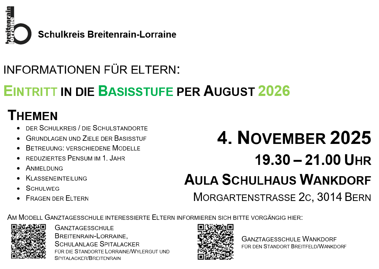 Für Fragen zur Ganztagesschule Breitenrain – Lorraine (betrifft Eltern aus den Schulstandorten Lorraine/Wylergut und Spitalacker/Breitenrain), wenden Sie sich an die Co-Schulleitung Sandro Durrer / Anna Barbara Feitscher, Tel 031 321 24 02.